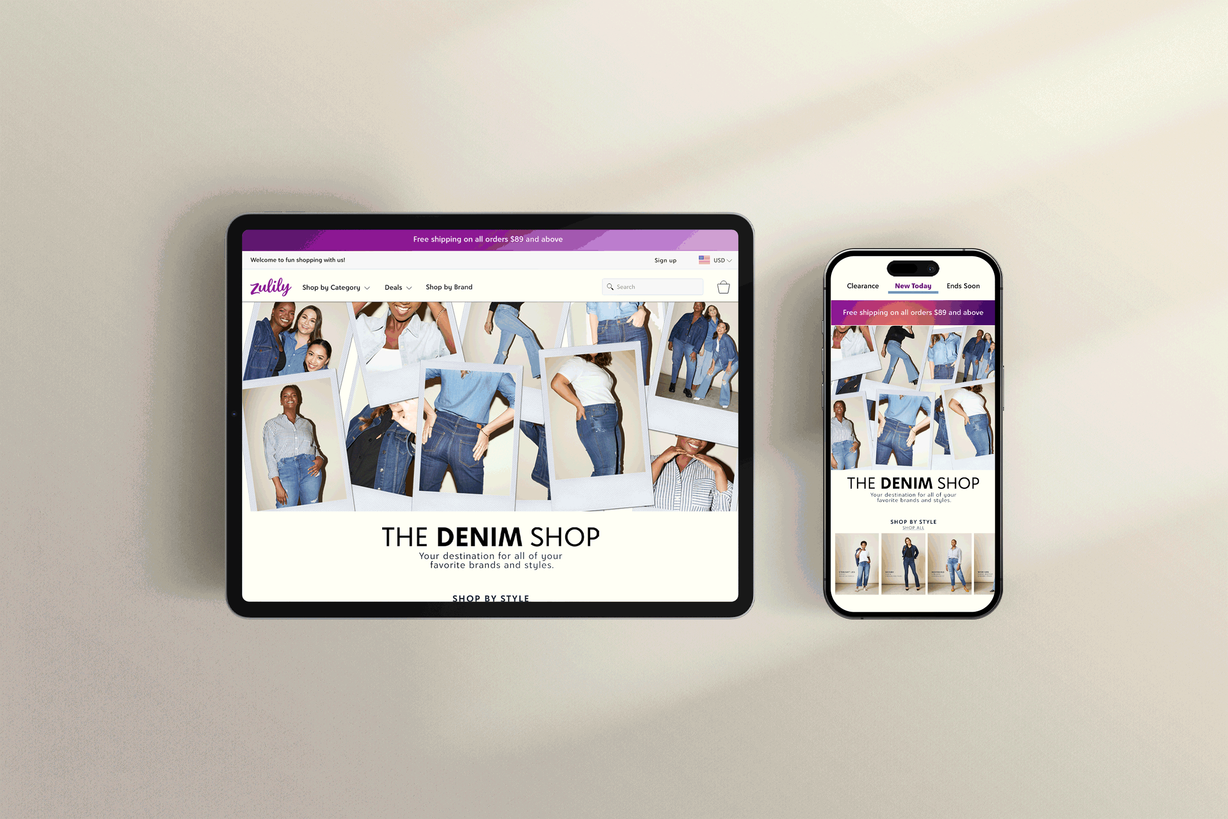 The Denim Shop was the answer to the challenge of how to elevate the Zulily customer experience and create a curated shop that showcased brand name denim offerings — brands that otherwise tended to get lost in Zulily’s large product assortment. The branded experience included a shop and digital campaign that leaned on modern editorial imagery to create an on-trend shopping destination for premium denim brands.